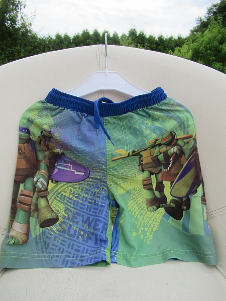 Klučičí moderní koupací šortky, všité síťkované slipky, vhodné jako chlapecké kraťasy na volný čas i jako dětské sportovní plavky pro kluky vel. 110-116, pro předškoláky s motivem Želvy Ninga, barvy pestré, modrá, zelená.
