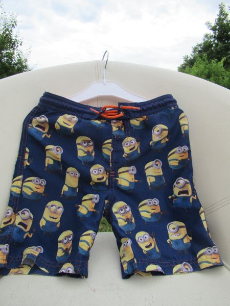 Klučičí moderní koupací šortky, všité síťkované slipky, vhodné jako chlapecké kraťasy na volný čas i jako dětské sportovní plavky pro kluky vel. 110 s motivem Mimoňů, žluto-modré barvy, vypráno a vyžehleno.