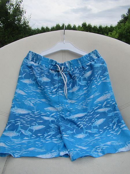 Klučičí moderní koupací šortky, všité síťkované slipy, vhodné jako chlapecké kraťasy na volný čas i jako dětské sportovní plavky pro kluky vel. 128, modré barvy s motivem moře a žraloků.