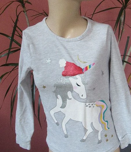 Vánoční světle šedé tričko s jednorožcem pro holky 6-8 let vhodné i jako pyžamové.