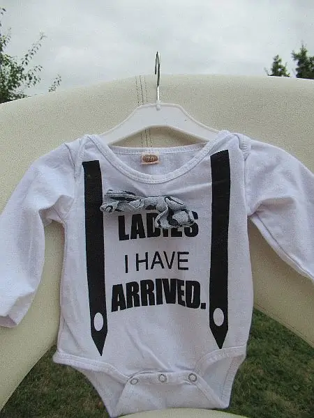 Bílé slavnostní secondhand body s dlouhým rukávem, motýlek, nápis, velikost 62